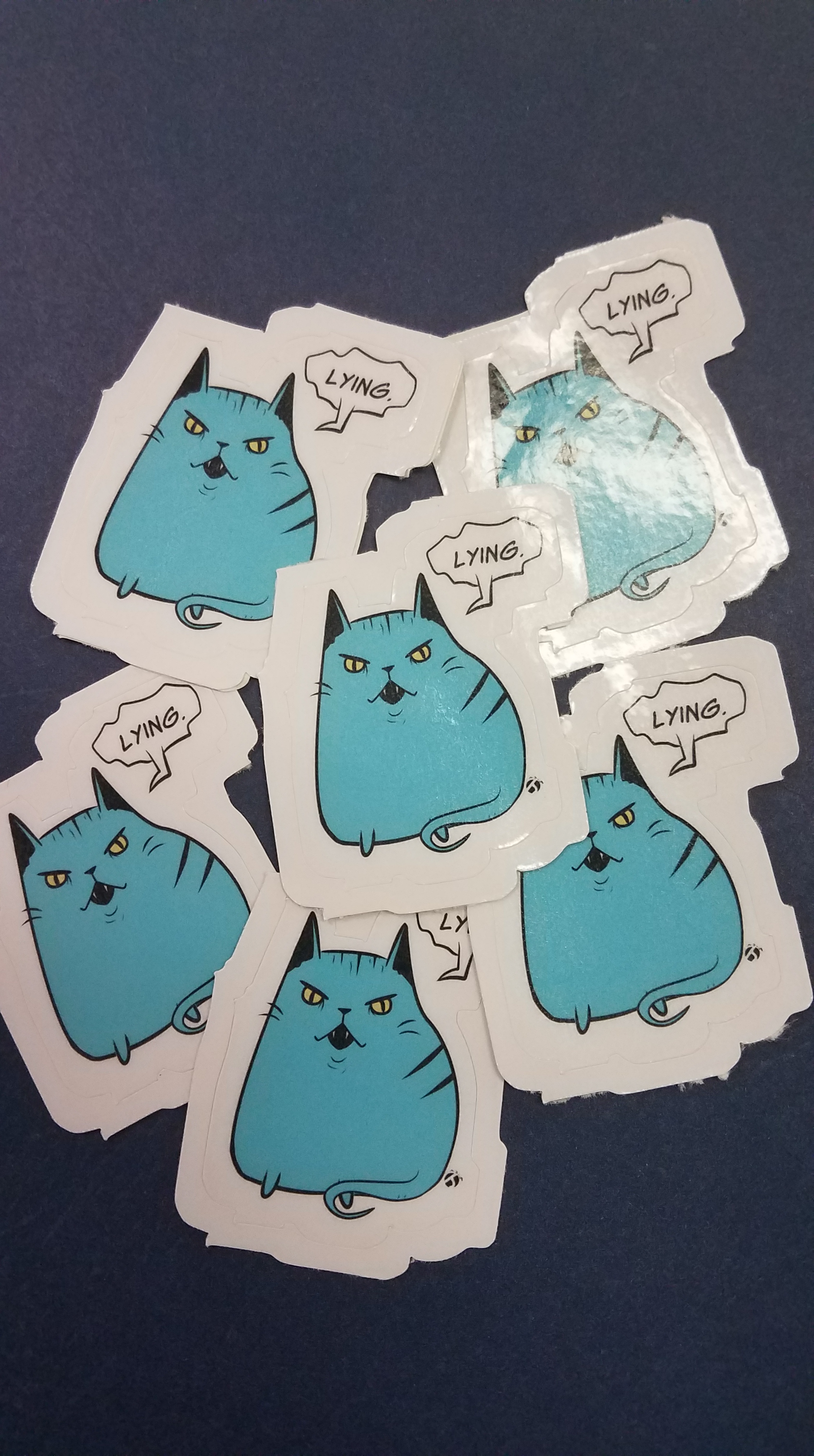 Item: Lying Kitty Stickers. A cute mash-up of iconic properties, this adorable parody will add grace and valor to any surface it adorns. Approximately 2.5” x 2”