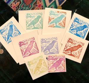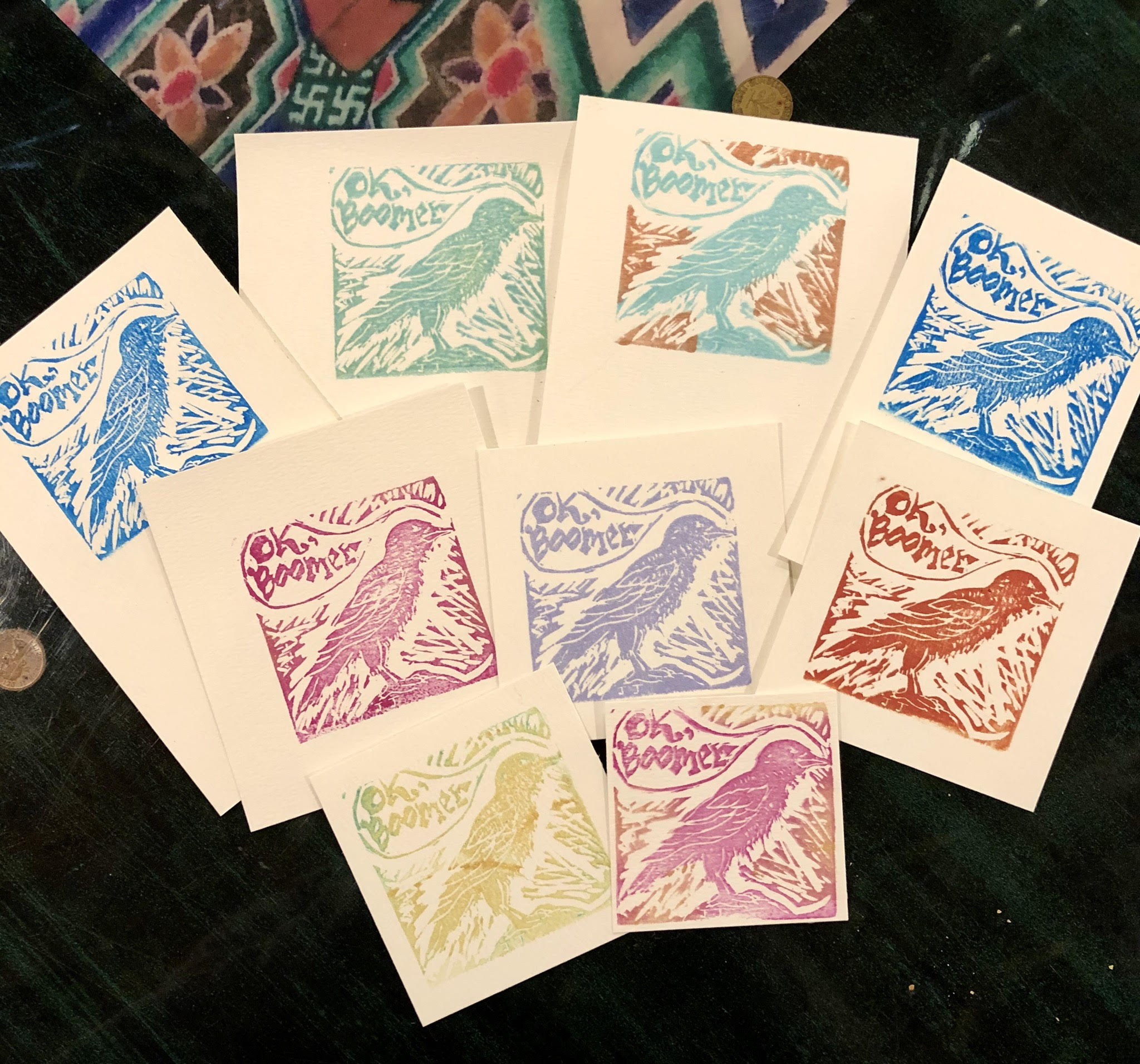 Item: OK Boomer Prints. A snarky blockprint comeback on those days when no other comeback will do. Prints range in size from 4″ x 4″ to 4″ x 5-6″.