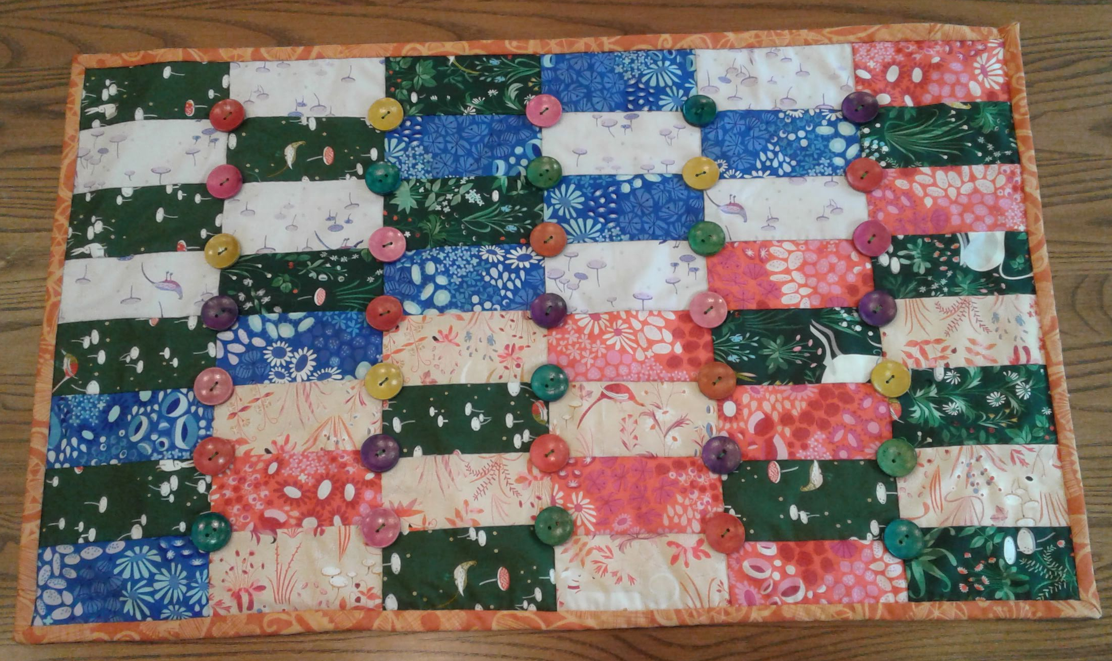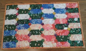 Item: Enchanted Button Forest Mini Quilt. This whimsical wall art features bright patchwork rectangles quilted together with painted wooden buttons. Piece measures 19” x 31” and can be hung horizontally or vertically.