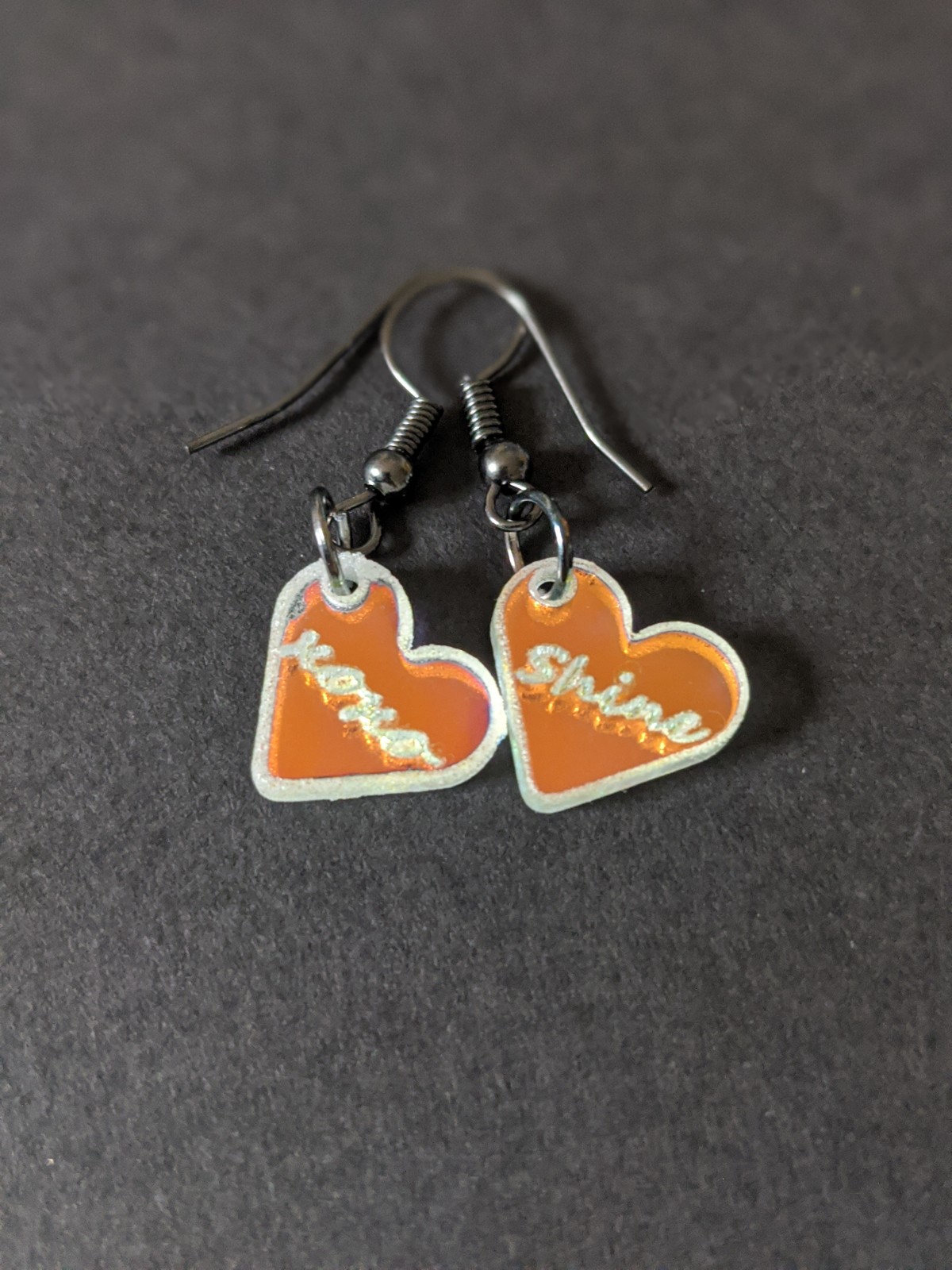 Item: Conversation Heart Earrings. Have a message you want to share? These hollographic acrylic hearts will help you! Pick out two of the same or mix ‘n match two for a more complex communique.