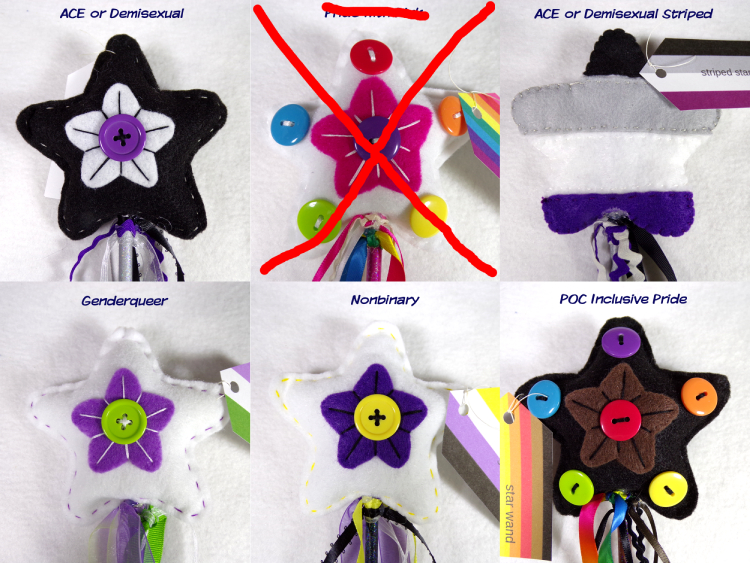 Star Wands. Star wands, in various PRIDE flag colors, are about 15″ long. The felt star at the top is about 3 inches across at the widest point. It’s lightly stuffed, and decorated with plastic buttons and ribbon streamers (striped ace flag has no buttons). The dowel handle is painted in coordinating colors (and glitter!), and has a small stuffed felt cap at the end opposite the star. Choose from the following pictured above:
