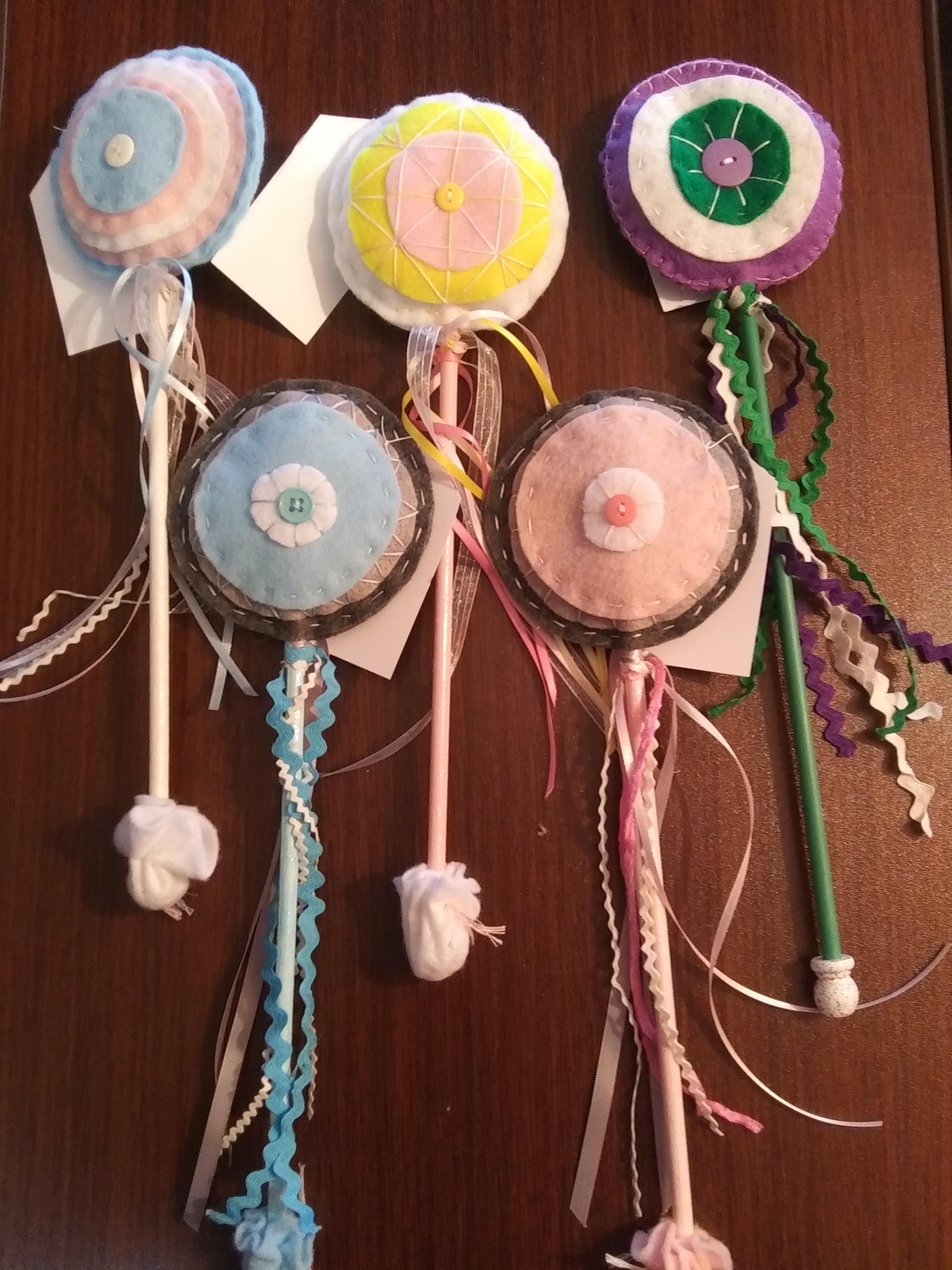 Materials: Synthetic eco-felt, plastic buttons, wooden dowel painted with non-toxic acrylic paints and sealers, polyfill, embroidery thread, polyester ribbons.