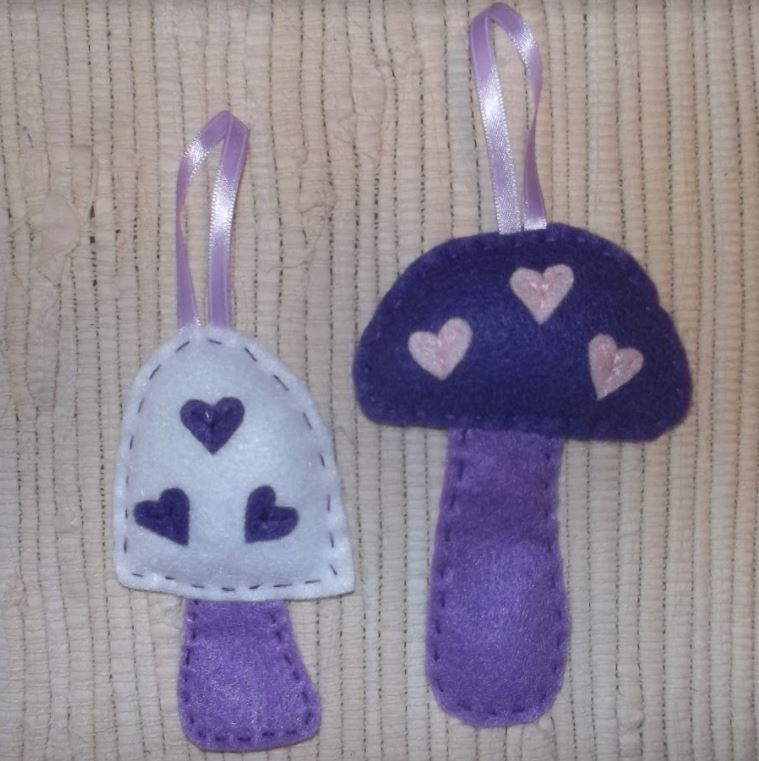 Item: Fantasy Mushroom Ornaments. A cute mushroom ornament in various colors, with heart spots on the front of the cap. The entire ornament is hand-stitched. The cap is lightly stuffed, the stem is not. The taller mushroom is 5 ½ inches tall, the shorter is 5 inches tall, and the ribbon loop is about 2 ½ inches.