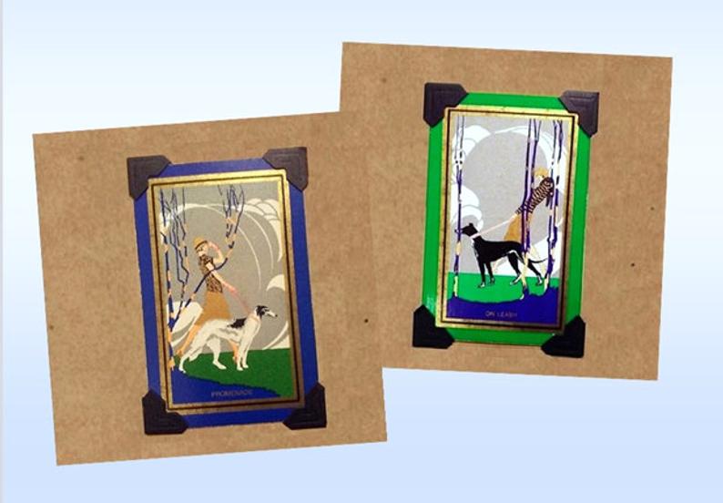 Item: “Art Deco Dog-Walkers Blank Note/Birthday Card Set” – 6 Cards. Our sets of uniquely upcycled greeting cards give you 3X the fun of ordinary greeting cards! Use them as blank notes to keep in touch with friends anytime, or add a peel-and-stick greeting to celebrate a birthday! After the birthday, the vintage playing card on the front makes a great embellishment for scrapbooking and crafts. These handsome Art Deco style cards feature elegantly dressed women walking their borzoi and whippet. Kraft paper cards measure 5” x 5” and come with kraft paper envelopes. Item © Peel-and-Stick Greetings Copyright 2019. LoyaltyOfDogs.com. All Rights Reserved.