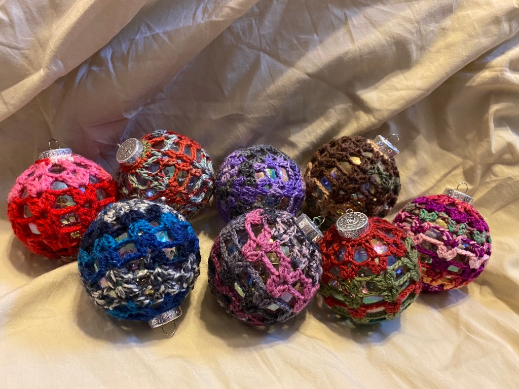 Item: Crochet Baubles Grab Bag (5 baubles/pack). The Crochet Baubles Grab Bag includes five randomly chosen 3-inch plastic iridescent ball ornaments adorned with a crochet “sock.” Each bauble contains tiny bells inside – they’re fun to shake! The yarn used for these items vary in material and may include wool, nylon, and/or acrylic blends.