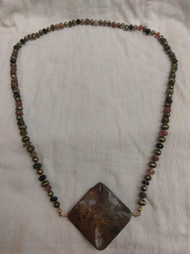 Item: Semi-Precious Stone Necklace. Medium length, over-the-head (no clasp) necklace of alternating olive green freshwater pearls and faceted rondelles in varying purple tones (possibly amethyst), knotted on gold silk cord. Center stone is a flat, dark brown, diamond-shaped stone (possibly bronzite), measuring 2 1/4 inches across. Necklace hangs about 12 inches long when worn. Entire length, including pendant, is approximately 24 1/4 inches. Gold colored findings and wire where pendant is attached.