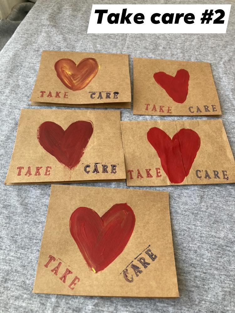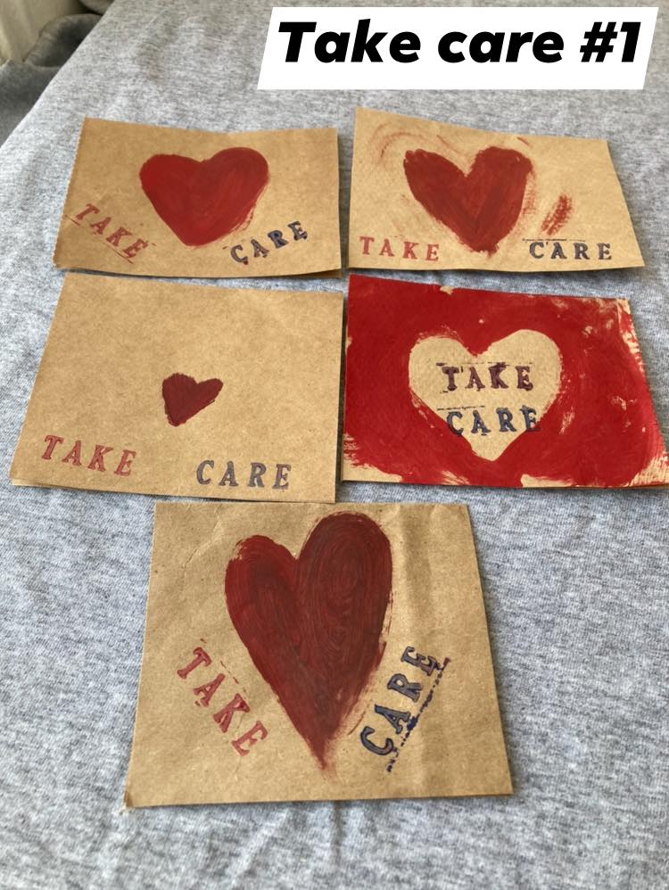 Item: Take Care Brown Paper Notecards. Three simple note cards to say thanks. Blue hearts drawn on brown paper note cards about the size of a playing card. Each card has “thank you” stamped on it. Each card has a unique design.