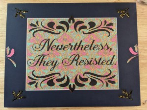 Item: Nevertheless Plaque. This elegant wall art is a reminder of what we can do when we don’t give up. Reads “Nevertheless, They Resisted.” against a delicate scrollwork background.